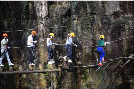 果然,第一项就是单人滑索,恐高胆小者勿进噢!紧接着走木桩、爬绳网、攀悬崖、连电视里的走钢丝都上演了。一路上尖叫声不断,欢笑声不绝。