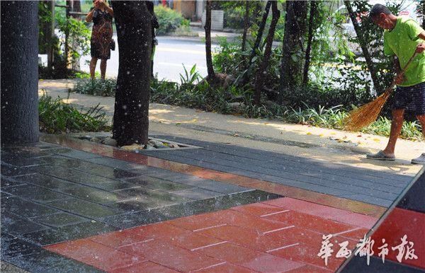 外面艳阳高照,而成都市活水公园一块20平米左右的小广场内却“电闪雷鸣,暴雨如注”,伴随着模拟的闪电和雷声,人工形成的雨水在地上溅起水花,这一场景引来公园里不少市民前来围观。令人惊奇的是,流下的雨水没有在地面形成积水,而是通过渗透道路很快流走。这个名为“海绵城市试验平台”的小广场是成都活水公园海绵城市改造的一部分。试验平台由雨水净化系统、PP调蓄模块、模拟降雨系统等构成。工作人员介绍,该模拟降雨系统可根据需求模拟小雨、中雨、大雨和暴雨等强度的降水。据了解,由渗透广场、渗透道路、净化溪流、下凹式绿地、垂直绿化和雨水调蓄等设施组成的雨水自然处理系统是这次改造的亮点。通过自然渗透、自然调蓄和自然净化将活水公园85%的雨水径流进行控制,并对雨水进行过滤以及再利用。